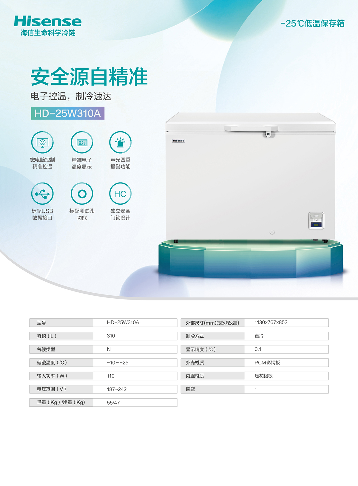 技术参数:有效容积:310L存储温度:-10 ~ -25℃外形尺寸:1130x767x852(宽x深x高)mm 重量:46kg温控系统:微电脑控制系统:箱体内置高精密度传感器,保持箱体内部温度准确测温;直冷设计,合理分布蒸发器盘管,冷冻速度更快,保证箱内温度均匀性;超微孔发泡层:行业内优质发泡技术,发泡更均匀,保温效果更好;使用感文探头放置盒,感温探头使用更长久。制冷系统:采用无氟环保制冷剂,高性能无污染冷媒材质;高效蒸发器,高效冷凝器,制冷迅速。采用国际知名品牌压缩机,制冷效率高,静音节能;箱框采用防露管无霜设计。安全系统:专业的声光四重报警功能:高温报警、低温报警、传感器故障报警、断电报警功能;双重报警方式:声音蜂鸣报警、灯光闪烁报警;断电报警持续24h以上;独立安全门锁设计,防止任意开启;发泡门体在抬起角度超过60°以上时,具有悬停功能人性化设计: 箱体采用优质结构钢板,经过先进防腐磷化、喷涂工艺处理;带储物筐,方便用户储藏;万向脚轮设计,可移动、锁定,并根据要求实现微调,节省人力;配有测试孔功能设计,方便用户自行添加第三方传感器; 187-242V宽电压设计,并备有断电记忆功能;